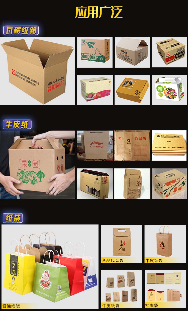 適用范圍:牛皮紙、瓦楞紙、卡紙、白板紙、黃板紙、紙袋、紙盒、紙箱